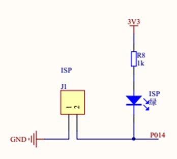 可以看到,只有当短接J1的时候,P014才会为低电平。所以,短接核心板的J1跳线,此时,ISP指示灯点亮