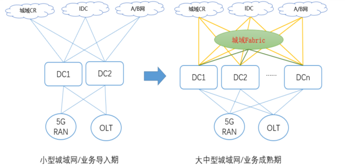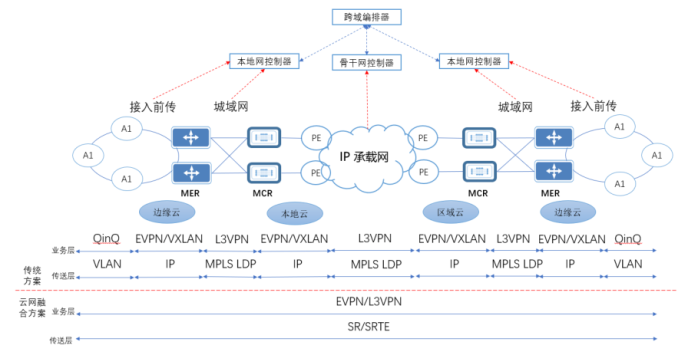 传统城域网需要将接入、边缘云、城域网、本地云、骨干IP承载网、区域云等多个由不同技术实现的网络进行拼接,业务编排和业务维护均非常复杂。