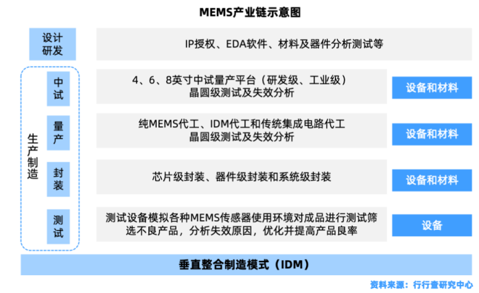 MEMS产业链的上游包括MEMS器件设计、材料和生产设备的研发和供应,中游包括MEMS器件的制造加工和封装测试、下游使用MEMS产品集成终端电子产品。