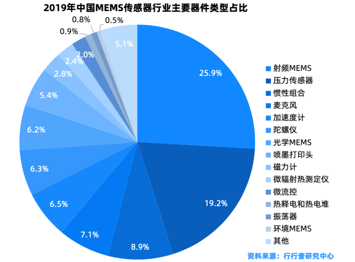 中国市场结构与全球类似,数据显示2019年国内射频MEMS产品收入占比为25.9%;压力传感器占19.2%排第二位,麦克风、惯性组合、加速度计分别占比7.1%、8.9%、6.5%。