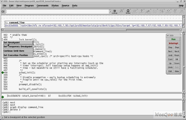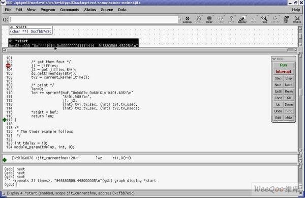 DDD> 或GDB> 表示是开发主机上的DDD的调试窗口中