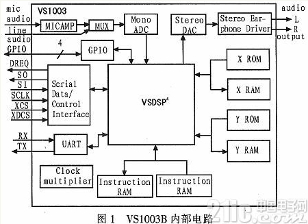 VS1003B是由芬兰VLSI公司出品的一款单芯片的MP3/WMA/MIDI音频解码和ADPCM编码芯片,其内部电路如图1所示。由图可见,VS1003B包含一个高性能、具有自主产权的低功耗DSP处理器内核VSDSP,工作数据存储器为用户应用提供5 kB的指令RAM和0.5 kB的数据RAM,串行的控制和数据接口,4个常规用途的I/O口,一个UART,一个高品质可变采样率的ADC和立体声DAC,还有一个耳机放大器和地线缓冲器。