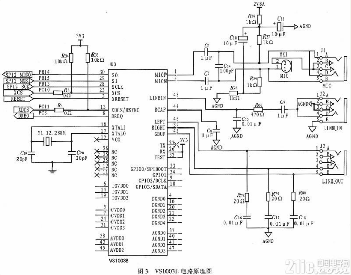 VS1003B电路原理图如图3所示。J1为麦克风输入插座,用于连接麦克风。J2为外部声音输入插座,连接音源。J3为耳机输出插座,连接耳机,由于内部具有耳机驱动器,VS1003B输出信号不需经过任何功放电路,从而简化了硬件电路。VS1003B各部分的供电电压不同,IOVDD(I/O电压)为3.3 V,CVDD(数字电路电压)为2.5 V,AVDD(模拟电路电压)为2.8 V。最大的采样率XTAL1/256,决定了能以正确的速度播放的音频采样率。例如,如果要播放48 kHz采样率的音频,XTAL1至少为12.288 MHz才能获得正确的播放速度。
