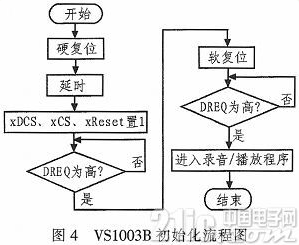 在设计中,STM32F103VET6通过SPI总线对VS1003B进行控制,也就是通过VS1003B的串行数据接口SDI和串行控制接口SCI实现STM32F107 VCT6与VS1003B的通信。VS1003B初始化流程如图4所示。其中,DREQ为高时可判断为硬件复位或软件复位结束。