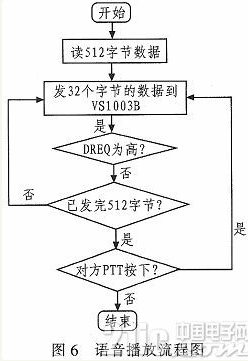 播放前将对方传来的语音数据存放到STM32的缓冲区,缓冲区的大小设置为512字节,一般一次读一个扇区,然后将数据发往VS1003B。由于VS1003B有32字节的数据缓冲区,一次可以发32个字节的数据,然后检测DREQ,当DREQ为高时送下一个32字节的数据,直到发完为止。 DREQ为高表明VS1003B可以接受新的数据,如果不考虑DREQ而直接连续的给VS1003B发音频数据,将会出现声音断断续续的情况。语音播放流程如图6所示,考虑到实际语音通信时,本地PTT键抬起时,对方会无法听到语音,因此流程图中采用判断对方PTT键的状态来处理是否播放。