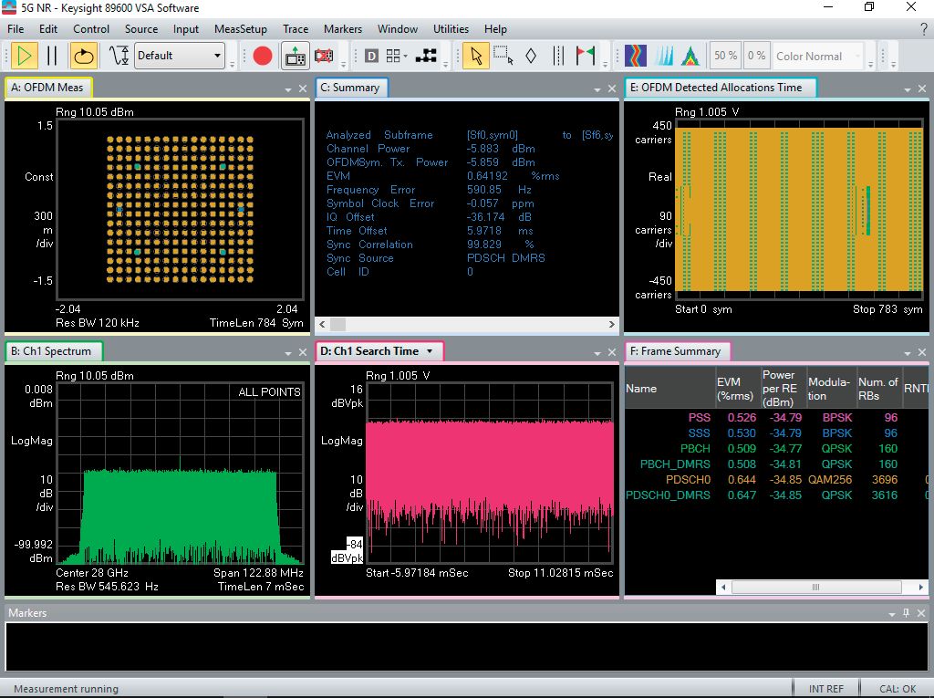 图 3. 使用 VSA 和 Keysight UXR 系列示波器捕获 28 GHz 5G NR 信号(注意,EVM 仅为 0.64%)