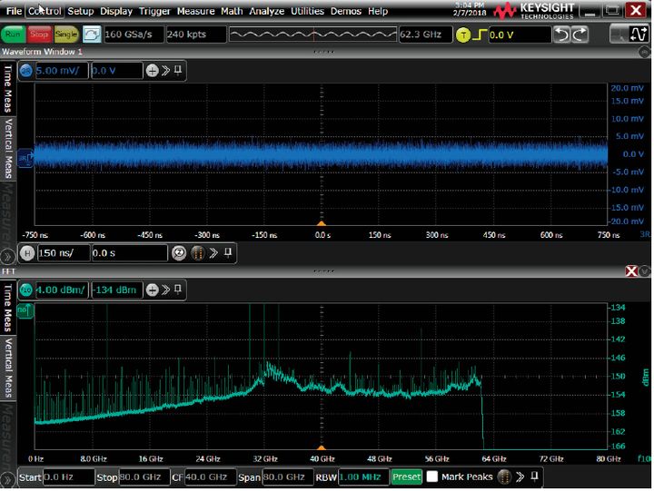 要在噪声方面做出权衡,最直接的办法就是为示波器配备全带宽前置放大器和采样器。然而, 具有极高带宽的部件目前还很稀少。市面上目前只有一款高端全带宽前置放大器和采样器, 这就是 Keysight UXR 系列示波器中专有的磷化铟 ASIC。在不采取 DSP 增强、交织采样或其他带宽改进方案的情况下,它的带宽可以达到 110 GHz(图 5)。