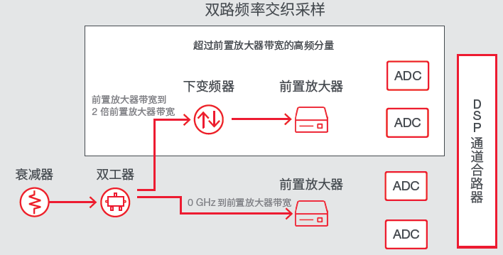 为了让这个方案行得通,示波器引入了60 GHz 信号,并使用双工器将其分成两个单独的 30 GHz 信号。这个步骤会得到一个 0 – 30 GHz(低带宽)信号和一个 30 – 60 GHz (高带宽)信号。对高带宽信号进行下变频,使两个信号都成功通过 30 GHz 示波器的前端。接下来对信号进行数字化、上变频并重新组合,形成一个 60 GHz 的信号。