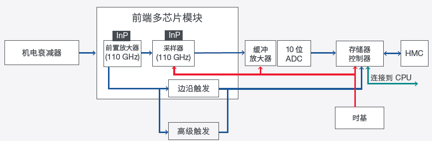图 4. 过去示波器实现 30 GHz 以上带宽的典型方法