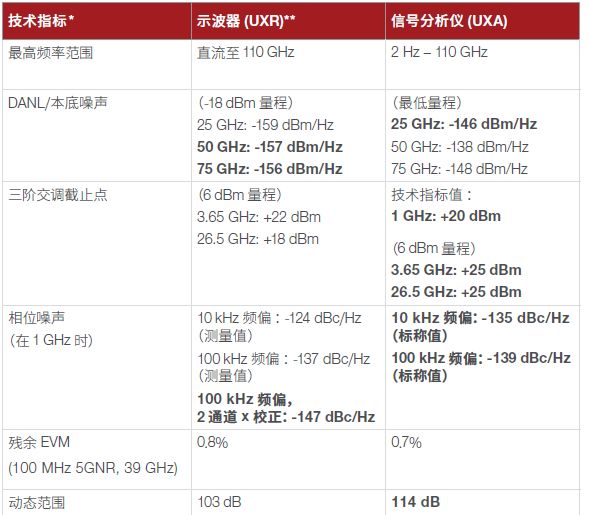 表 1. 性能技术指标——Keysight UXR 系列示波器与 Keysight UXA 系列信号分析仪* 此表中所有测得的技术指标均为是德科技研发部门实测得出,不是保证的技术指标。