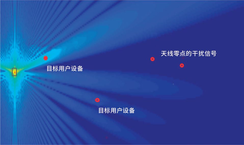 图 9. 50 单元线性阵列传播的二维时域双工仿真。单独的波束被导向目标用户设备 (UE),零点对准干扰源。