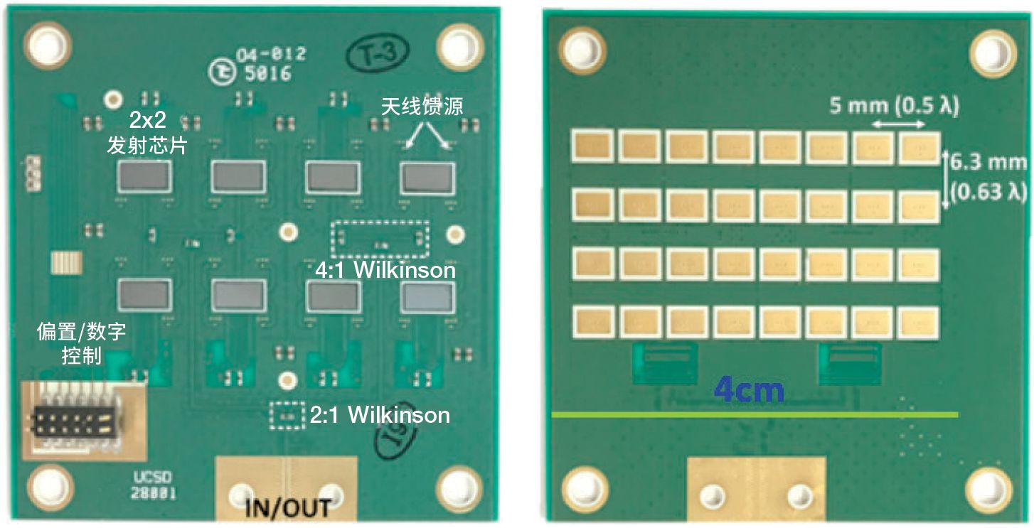 图 10. 印制电路板的两面,从中可见 28 GHz RFIC 与天线阵列高度集成。图片由加州大学圣迭戈