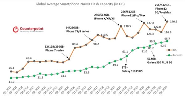 来自调研机构Counterpoint的统计数据显示,2020年,安卓手机的平均存储容量为95.7GB,iOS用户则达到140.9GB。