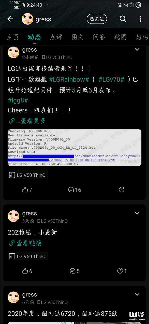 他同时表示,从固件编译信息推测,早在 3 月初,LG 就已经重启了研发项目。而 V70 公开版固件先于 U+ 运营商固件出现,则可能意味着 LG 要调整销售策略,在韩国地区不再严重依赖运营商渠道销售,以获得更高利润,不过这也意味着国内能够买到的低价 LG 手机将大大减少。
