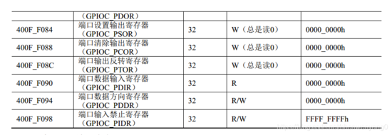 GPIO有三组寄存器,分别为GPIOA、GPIOB、GPIOC。每组有7个寄存器,分别为输出寄存器(PDOR)、输出置1寄存器(PSOR)、输出清0寄存器(PCOR)、输出取反寄存器(PTOR)、输入寄存器(PDIR)、数据放向寄存器(PDDR)、输入禁止寄存器(PIDR)。