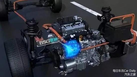 也有采用ISG(Integrated Starter Generator/集成启动)技术的车型,通过发动机和电机扭矩叠加进行动力混合,并与变速箱并联,仍以发动机为主动力源,但节油效果优于BSG。
