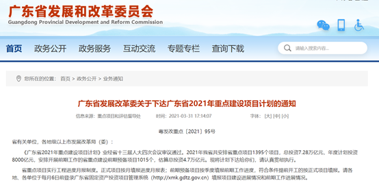 近日,广东省发展改革委发布关于下达广东省2021年重点建设项目计划的通知。2021年广东共安排省重点项目1395个项目,总投资7.28万亿元,年度计划投资8000亿元。