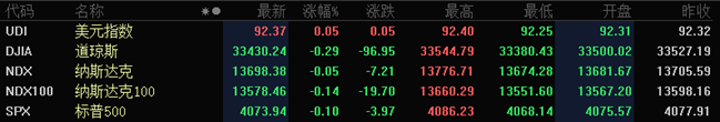 美股方面,道琼斯工业平均指数小幅下跌96.95点,跌幅为0.29%,报33430.24点。纳斯达克综合指数小幅下跌7.21点,跌幅为0.05%,报13698.38点。标准普尔500指数小幅下跌3.97点,跌幅为0.10%,报4073.94点。