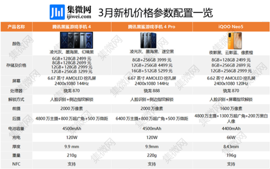 黑鲨一直是游戏手机里性价比最高的,新机也是如此,黑鲨4全系标配三星144Hz高刷屏,支持120W充电,设计更接近普通手机,机身重量控制的还不错,缺点是采用侧边指纹,不过现在很多屏幕指纹的位置设计的并不好,有些还不灵敏,使用体验不一定比侧边指纹好。iQOO Neo5的性价比也很高,硬件配置和机身重量控制的不错,在一众骁龙870手机中属于硬件配置比较均衡的机型。