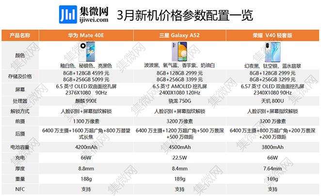 华为Mate 40E是Mate 40的换芯版,其他硬件配置没变,麒麟9000缺货,麒麟990E性能也不错,售价更低,喜欢华为手机,这款也是不错的选择。三星Galaxy A52搭载骁龙750G,售价2999元起,对比其他同价位机型售价偏高。荣耀 V40轻奢版可以看作是维持热度的机型,缺芯片导致这款手机的性能不足,但该机手感很不错,适合喜欢曲面屏,轻薄手感的用户。