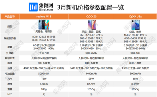 realme V13和iQOO U3x都是入门级5G手机,硬件配置realme V13更好一些,价格也更高一些,现在手机想要用的久,还是要买性能好,存储版本大的。iQOO Z3属于中端手机,硬件配置不错,充电功率更高,摄像头像素更高,性价比也不错。