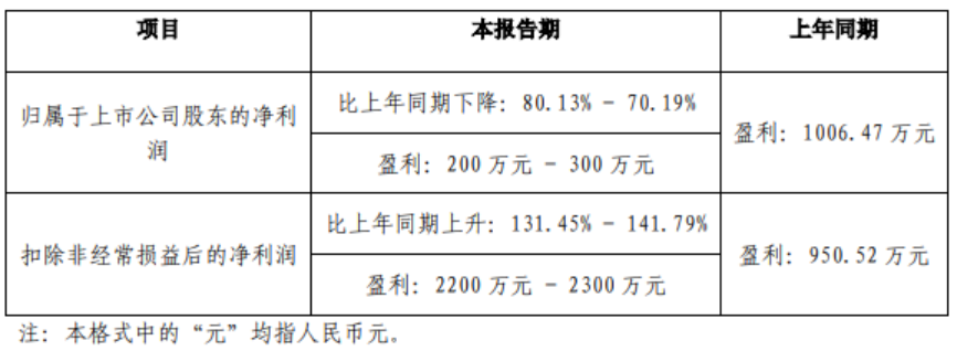 4月7日,上海新阳发布Q1业绩预告称,公司实现归属于上市公司股东的净利润为200万元-300万元,同比下降80.13%-70.19%;上年同期盈利为1006.47万元;其扣非净利润为2200万元-2300万元,同比增长131.45%-141.79%,上年同期盈利为950.52万元。