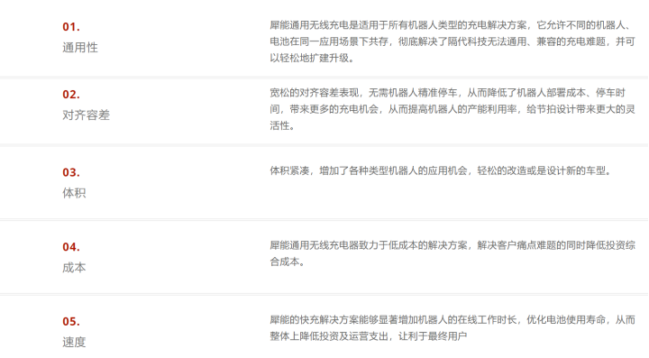 犀能官网显示,专有的通用非接触式充电技术,可以为所有使用任何电池的机器人充电。无论是上世纪末购买的机器人,还是未来最先进的机器人,可以共用同一个充电平台。犀能品牌非接触充电产品有非常宽松的对齐容差,以及小巧紧凑的外形尺寸,加上它的快速充电能力,能够显著提高机器人的在线运行时间。