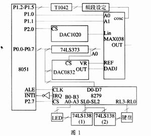 Intel公司的MCS-51系列中的8051单片机应用已很成熟,以其为基核的其他8位机都有极好的兼容性,应用十分方便。图1所示为以8051和MAX038为核心的系统硬件电路。