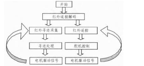 本设计中自动寻迹模块主要由单片机及其外同电路、红外寻迹电路、直流电机控制电路等组成。正常工作时,单片机循环检测红外寻迹电路输出信号,据此产生直流电机控制信号,当系统检测到工作方式发生改变时,系统进入相应方式。其原理框图如图1、图2所示。
