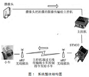 本文中的设计系统由智能小车和摄像头控制模块两部分组成,为满足集群控制的需要选用3辆小车,小车由两轮驱动,便于在行走过程中调节方向。每辆小车搭载NRF无线模块和测速模块,可以实现小车的旋转角度测量以及速度调整。跑道的正上方是USB摄像头,通过5 m长的延长线与地面的主控板相连接。为满足数据的实时处理及多任务控制的需要,主控板采用Tiny2440四核CortexA9核处理器,搭载Linux系统,通过QT的设计使得操作界面美观易操作。为减轻处理器内核的负担以及确保传送指令的准确性[3],指令的校验工作由外围的STM32芯片处理,并通过nRF模块与小车通信。系统整体结构图如图1所示。