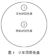 小车的顶部色盘必须同时具备小车位置定位和方向定位功能。由于通过形状定位的传统方式对摄像头要求过高且识别精度有较大误差,本设计采用两个圆盘的颜色识别方式来实现这一功能。小车顶部色盘如图4所示。