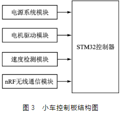 当直线行驶时,小车将通过测速码盘的脉冲输出来判断转速的大小,从而作出左右轮转速的调整。同时小车会将调整的结果存入到内部Flash中作为下一次启动时的调整数据,这样只要在实际运行前做测试调整,小车就会在直线行驶时,实现不同场地的阻力误差记忆。小车控制板结构图如图3所示。