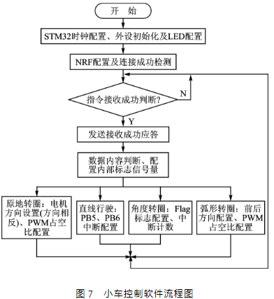 智能小车对于接收指令的实时响应决定了最终的控制效果,本文中的智能小车采用意法半导体公司的STM32F103C8T6作为控制芯片,通过产生的PWM信号来控制直流电机的转速。在实际控制过程中需要涉及到小车的定向旋转,以及直线行驶的问题,于是在小车中引入了光电红外对射管作为小车的测速模块。