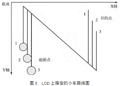 集群小车在行走的过程中为了防止相互之间的碰撞,必须采用相应的防碰撞措施。在本设计中采用角度与距离来实现防碰撞控制,当小车1和2之间的距离L 小车在防碰撞过程中若出现全部车辆停止(即进入锁死状态),则启动应急预案,使边缘小车在原地向锁死反方向转动相应的角度,并行走一段距离,以解除锁死状态[9]。 3.4 小车控制软件流程图 小车控制软件流程图如图7所示。 4 整体性能测试 为防止因环境颜色和光照的影响,测试场地为一块2 m×3 m的长方形布料,刚好是摄像头的拍摄范围。 ① 小车测试。通过直线行驶指令,将小车放在测试场地中,使小车直线行驶一段距离。小车将获得两个不同的PWM信号占空比,作为下一次启动时的配置参数。 ② 小车顶部色盘像素的采集。为消除因光照强度所引起的颜色误差,需先将与小车顶部色盘相同颜色的纸片放在场地中间,摄像头将采集这一坐标的像素值作为参考值[5],用于实际测试过程中的颜色识别与定位。 ③ 为小车设置起跑路线图。通过LCD屏,在上面为小车指定运动的路线图,其后小车将按照设定的轨迹行走。行驶过程中小车很好地实现了集群之间防碰撞的功能。 小车路线图如图8所示。 结语 基于颜色识别的集群控制系统,可以通过颜色的采集来实现定位,是自动控制和人工智能方面的一种可行方式,具有运行稳定、使用方便的优点。而多控制对象的集群控制理论的研究,使得多目标协同工作成为可能。基于此模式的智能控制设备具有广阔的应用前景。