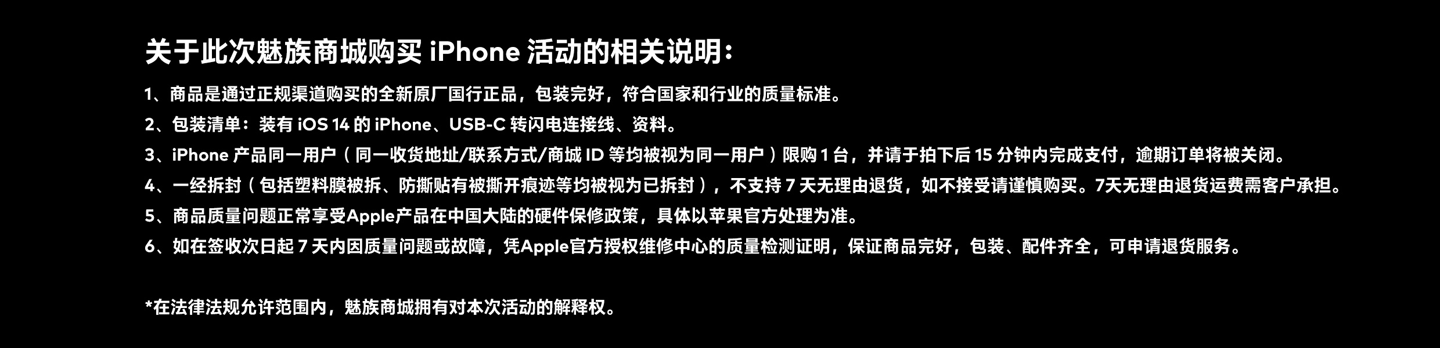 魅族商城在相关说明表示,该商品是通过正规渠道购买的全新原厂国行正品,包装完好,符合国家和行业的质量标准。iPhone 产品同一用户限购 1 台,需在拍下后 15 分钟内完成支付,且一经拆封(包括塑料膜被拆、防撕贴有被撕开痕迹等均被视为已拆封)不支持 7 天无理由退货。