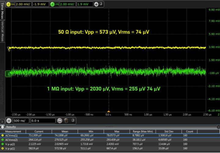 图 1. Keysight DSOS054A 的 50 Ω 和 1 MΩ 示波器输入的基线噪声比较。