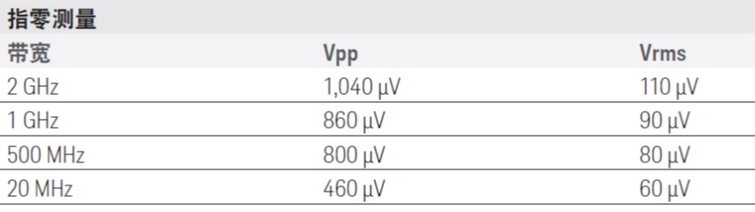 带宽是不是越高越好?不一定。示波器和探头的噪声电压与频率有关。通过将使用的带宽限制为给定测量所需的带宽,我们可以减少测量中出现的示波器和探头噪声。我们以图 2 中显示的测量为例进行说明。在这些测量中,我们使用了 Keysight MSOS804A 示波器(8 GHz,10 位 ADC,20 GSa/s)和 N7020A 电源探头(2 GHz,1:1 衰减)来执行前面提到的指零测量。测量结果汇总在表 1 中。