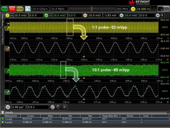 我们以图 3 中所示的测量结果为例进行说明。使用 10:1 探头和 1:1 探头分别测量同一个信号,即 20 MHz 50 mV p-p 正弦波信号。两次测量的唯一区别是衰减比不同。1:1 探头测得的值为 52 mV p-p,而 10:1 探头测得的值为 65 mV p-p。较高的衰减比使得信噪比降低,所以测量值超过实际值至少 25%。由此可以看出,在测量小信号时,示波器和探头噪声可能对测量结果有很大影响,此时最好使用尽量小的衰减比。
