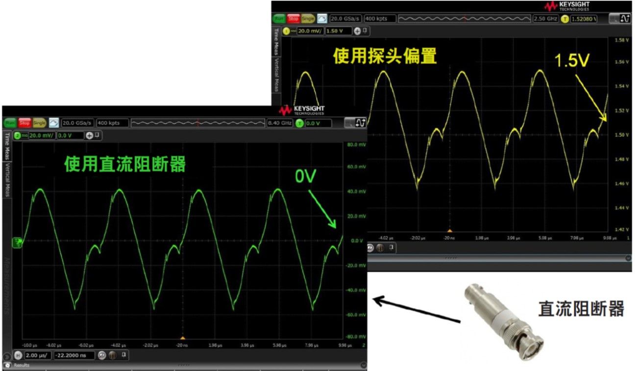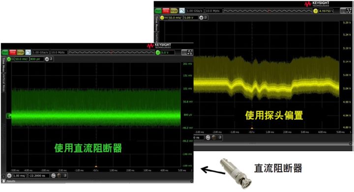 直流阻断器是一种专用的大电容,可以插入到信号与示波器输入端之间。直流阻断器的用途是阻断或去除信号中较大的直流分量,以便将示波器设置到更灵敏的量程,这一测量原理与前文中关于使用探头偏置的原理是一样的。直流阻断器的缺点在于它除了阻断直流内容之外,还会阻断低频交流内容,例如漂移或电源压缩。图 5 显示了分别使用直流阻断器和具有探头偏置功能的 N7020A 电源探头对 5 V 直流电源进行测量的比较。从这个例子中,您可以看到使用直流阻断器进行的测量会去除低频电源漂移并可能产生误导。另外,由于直流信息被阻断,测量结果中没有包括这一信息,因此无法通过示波器确定存在电源噪声的直流值。想要获取这个信息,还需要额外使用数字万用表或进行类似的测量。为了说明这一点,图 6 对比了分别使用直流阻断器和具有偏置功能的 N7020A 电源探头对 1.5 V DDR3 电源进行测量的结果。