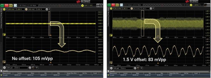 图 4. 使用和不使用探头偏置时测量 1.5 V 直流电源的噪声。