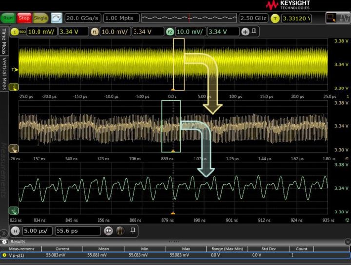 由于直流电源噪声的带宽很宽,因此在测量这一噪声时,用户往往更喜欢使用示波器,因为示波器不仅具有非常宽的带宽,而且简单易用,容易获得。示波器还可以对噪声的成因提供独特的分析视角,请看下面的例子。