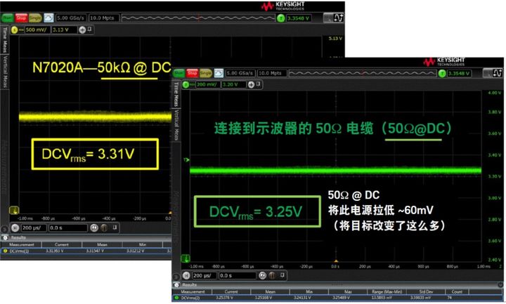 图 7. 探头负载效应对电源的影响。使用直流阻抗为 50 kΩ N7020A 电源探头探测 3.3 V 电源,再通过直接连接到示波器的 50 Ω 输入端探测同一电源。