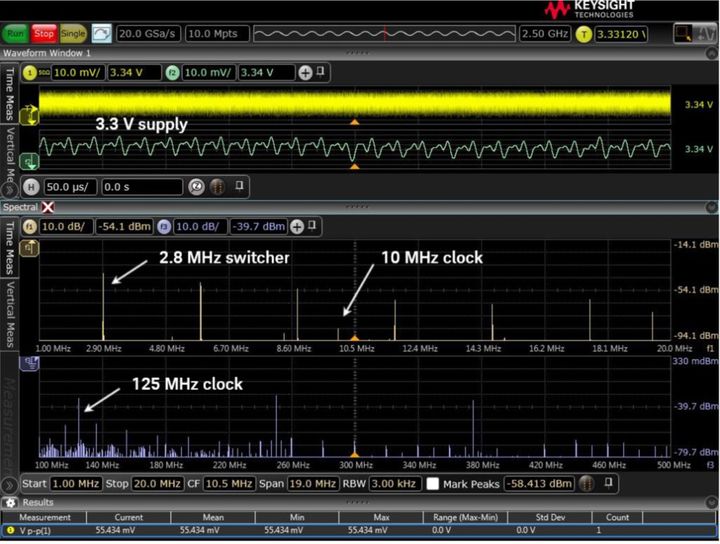 在这个示例中,我们有一个开关直流/直流转换器,它可将 5 V 转换为 3.3 V。转换器的工作频率为 2.8 MHz。在印刷电路板上还有一个 10 MHz 时钟和一个 125 MHz 时钟在运行。我们利用之前的技巧,使用衰减比为 1:1 的 Keysight N7020A 电源探头,应用 3.3 V 探头偏置,并将带宽限制在 500 MHz,经过这些设置后再来测量 3.3 V 电源的噪声。探头与 Keysight S 系列示波器相连。图 8 在时域中显示了这种测量的结果。从时域视图中,我们可以看到周期为 ~360 ns 的信号,这是 2.8 MHz 的残余,但 10 MHz 时钟和 125 MHz 时钟给 3.3 V 电源带来的噪声并不明显。