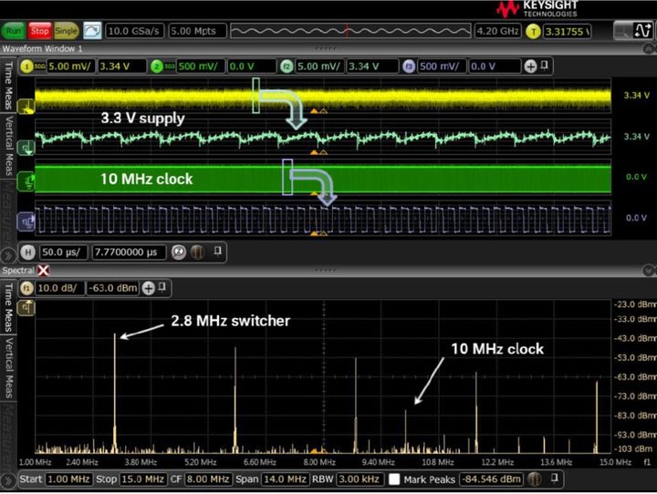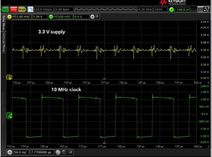 图 10. 目标系统中 3.3 V 电源和 10 MHz 时钟的测量结果。通过 FFT 我们可以验证 10 MHz 时钟是否在 3.3 V 电源上产生了噪声。