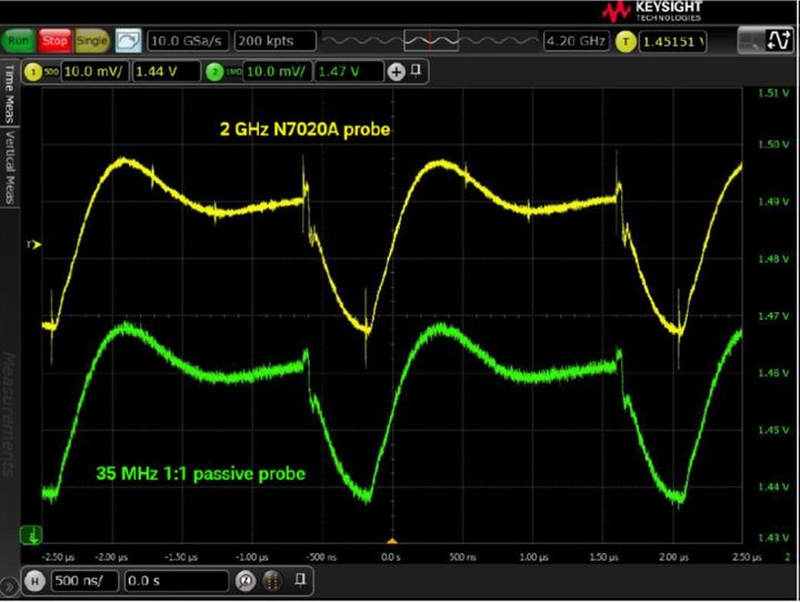 图 12. 分别使用 35 MHz 1:1 无源探头和 2 GHz N7020A 电源探头测量 1.5 V DDR3 存储器电源噪声的结果比较。带宽较低的探头没有发现影响高速数字系统的高频噪声和尖峰。