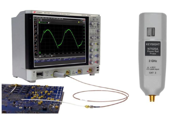 图 13. N7020A 电源探头(右)专为测量电源噪声而设计,可与各种是德科技示波器配合使用,包括 S 系列高清示波器(左)。