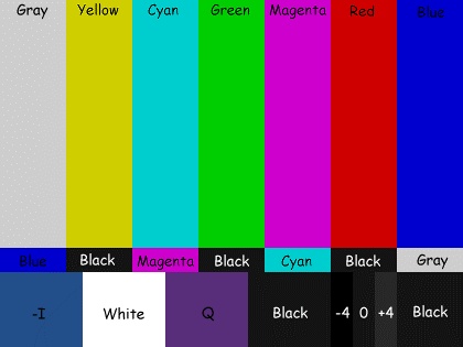 最后一行显示深蓝色的小块叫做I,接着是100 IRE超白,另一种暗紫色的小块叫做Q,然后是7.5IRE的黑,之后的三小条被称为PLUGE,他们的亮度分别是-4IRE,0IRE,+4IRE,在校准监视器的时候用来观察黑色的层次的。通常-4和0应该是混合在一起无法区分,0和+4非常隐约的有差异,这说明显示设备的黑位层次是正确的。