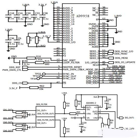 由于AD9958($25.1520)频率输出是一个电流型输出,等效模型为内阻为100KΩ的电流源。DAC输出电流的满量程值由外部电阻RSET决定,而需要设计的信号源是电压型输出并能提供一定的输出驱动能力,所以需要对ADC输出进行转换,并在滤波器后插入缓冲放大器。若采用中心抽头变压器进行电流电压变换,在低频时会造成插入损耗过大,固直接通过终端电阻来转换。输出驱动放大器采用高速放大器ADA4891-2($0.8400)。