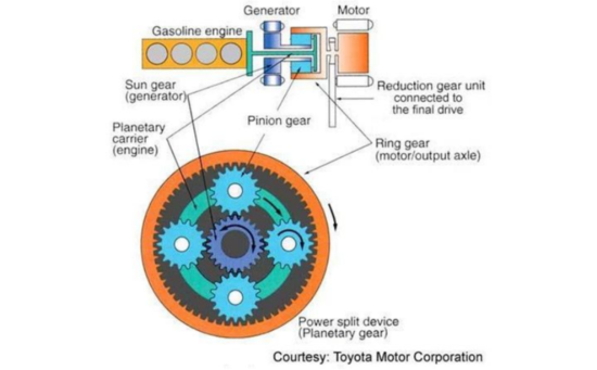 丰田THS混合动力系统通过一个行星排,让发动机、发电机、电机三者耦合在一起,发电机与太阳轮连接,发动机与行星架连接,电机与外齿圈连接并通过主减速器与轮端连接。