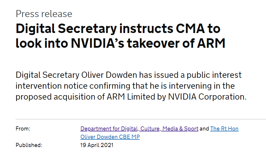 英国政府网于4月19日发布一则消息称,英国数字化、文化、媒体和体育大臣奥利弗·道登(Oliver Dowden)就英伟达收购ARM的提议发出了公共利益干预通知。